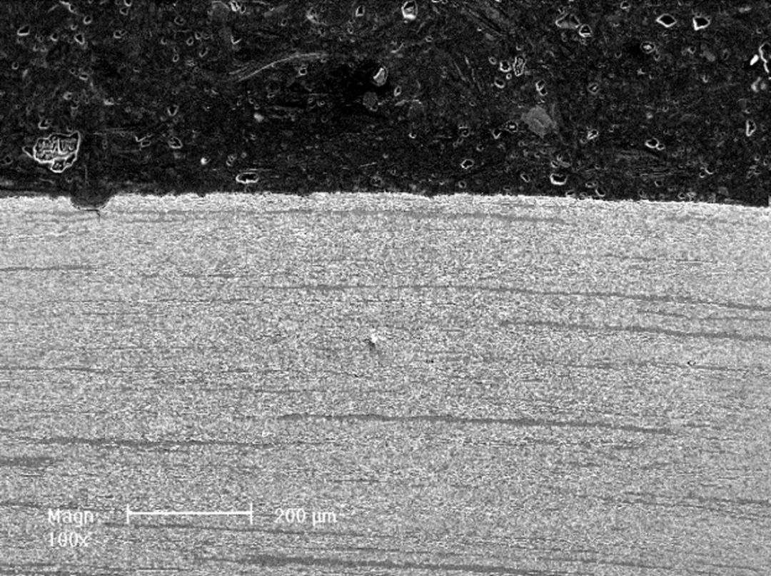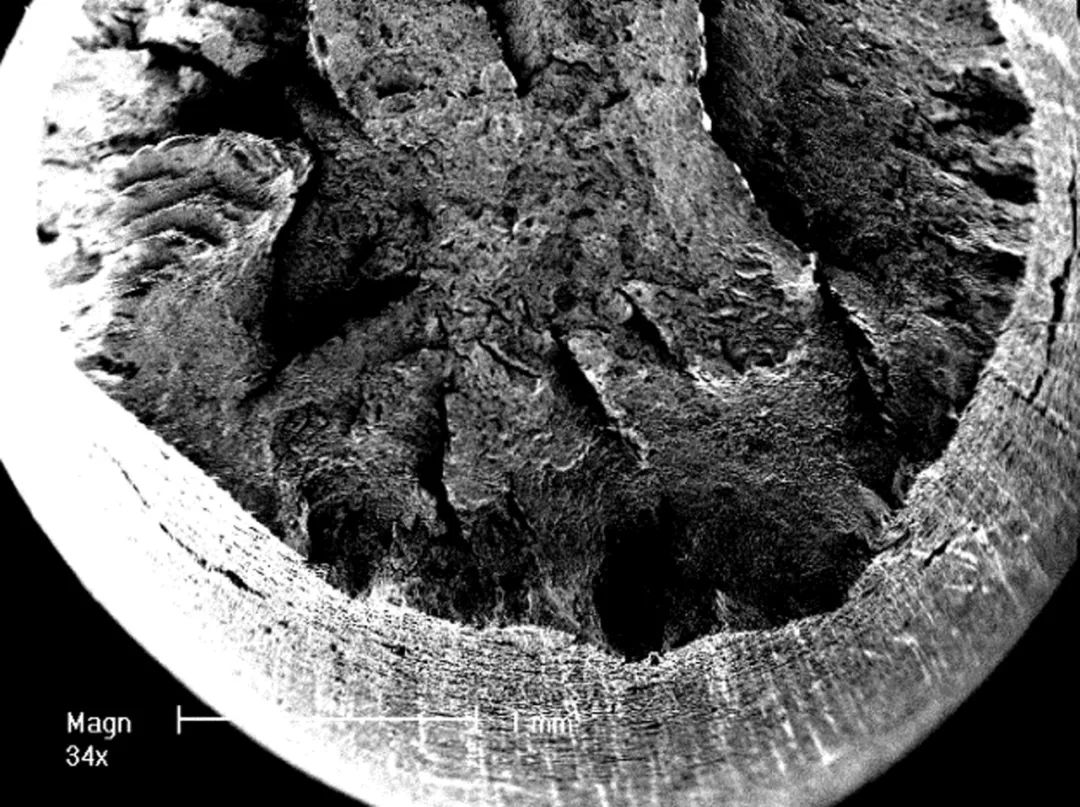 另取同批螺栓鍛件6件,對其進(jìn)行淬火:1020℃保溫后油冷至200℃以下出爐空冷至室溫,回火:600℃保溫后空冷至室溫的熱處理工藝,取其中3件試樣進(jìn)行力學(xué)性能檢測,其結(jié)果為:試樣7屈服強度806MPa、試樣8屈服強度811MPa和試樣9屈服強度794MPa。將剩余3件試樣進(jìn)行應(yīng)力腐蝕敏感性檢驗,其慢拉伸試驗(SSRT)結(jié)果均為0,說明此時S43100不銹鋼的應(yīng)力腐蝕敏感性很小,然后對編號為8的試樣進(jìn)行斷口掃描檢驗,如圖5所示,無明顯腐蝕斷裂情況出現(xiàn)。