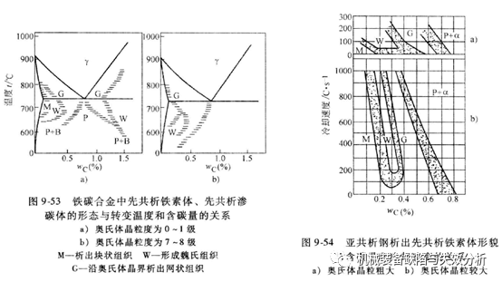 魏氏組織的形成與鋼中含碳量、奧氏體晶粒大小及冷卻速度(轉變溫度)有關,下圖表示各類鐵素體及滲碳體的形成溫度和含碳量的范圍。