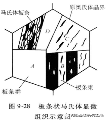 a)結構形態:馬氏體板條(D)→馬氏體束(B-2條;C-1條)→板條群(3~5個)→板條馬氏體;