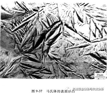 馬氏體轉變時在預先拋光的試樣上表面出現傾斜,產生表面浮凸。這個現象說明馬氏體轉變和母相的宏觀有著直接的聯系,說明馬氏體是以切變方式形成的;