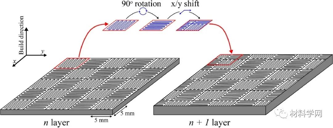 圖1 打印策略示意圖。島掃描旋轉(zhuǎn)90°并向前移動(dòng)x和y每層增加200米
