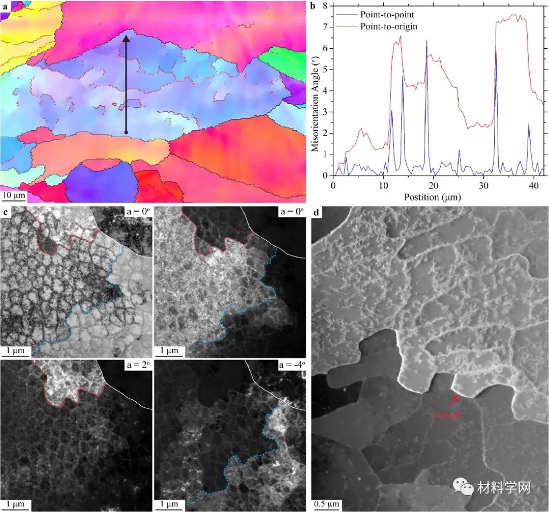 圖3 L-PBF 316L材料中的低角度晶界(LAGBs)。a,EBSD·IPF顯示出高角度的晶界(黑線)和低角度晶界(紅線).b,沿中所示的黑色箭頭的取向差a.c,在同一個(gè)區(qū)域的亮場(左上)和暗場(另外三個(gè))拍攝的四個(gè)透射電鏡圖像d,在不同區(qū)域拍攝的更高分辨率的暗場,顯示沿細(xì)胞壁運(yùn)行的LAGB(紅色箭頭)。