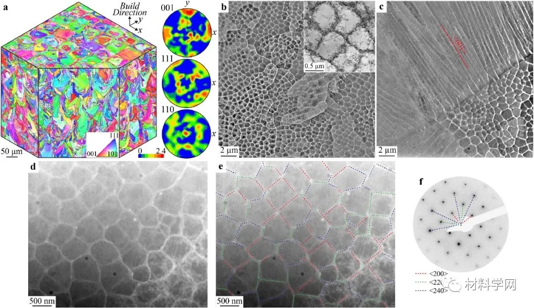 導(dǎo)讀:在激光粉末床熔接(L-PBF)法制作的316L奧氏體不銹鋼中,快速凝固形成的胞狀結(jié)構(gòu)在幫助實(shí)現(xiàn)高強(qiáng)度和高延展性起著至關(guān)重要的作用。但它們的內(nèi)在特性(例如晶體取向、位錯(cuò)、沉淀、元素偏析)以及各自對材料強(qiáng)度和熱穩(wěn)定性的影響的理解仍然模糊不清。本文發(fā)現(xiàn)胞壁遵循特定的晶體學(xué)方向,胞壁內(nèi)高密度的纏結(jié)位錯(cuò)具有更高的離解傾向,形成更寬的堆垛層錯(cuò),而氧化物沉淀被限制在細(xì)胞壁內(nèi)。這些特征在塑性變形時(shí)作為移動(dòng)位錯(cuò)的屏障,并有助于高強(qiáng)度。與傳統(tǒng)材料相比,L-PBF 316L SS在高溫下表現(xiàn)出更高的熱穩(wěn)定性和優(yōu)異的性能。