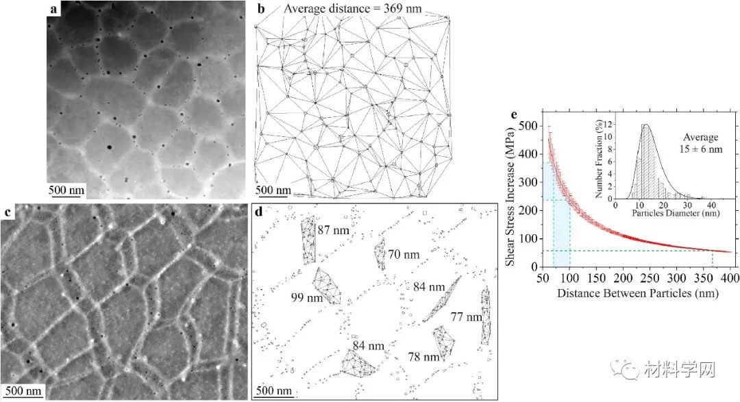 圖4 胞狀結(jié)構(gòu)中的沉淀物。插圖顯示了根據(jù)中的圖像計(jì)算的沉淀物尺寸分布。