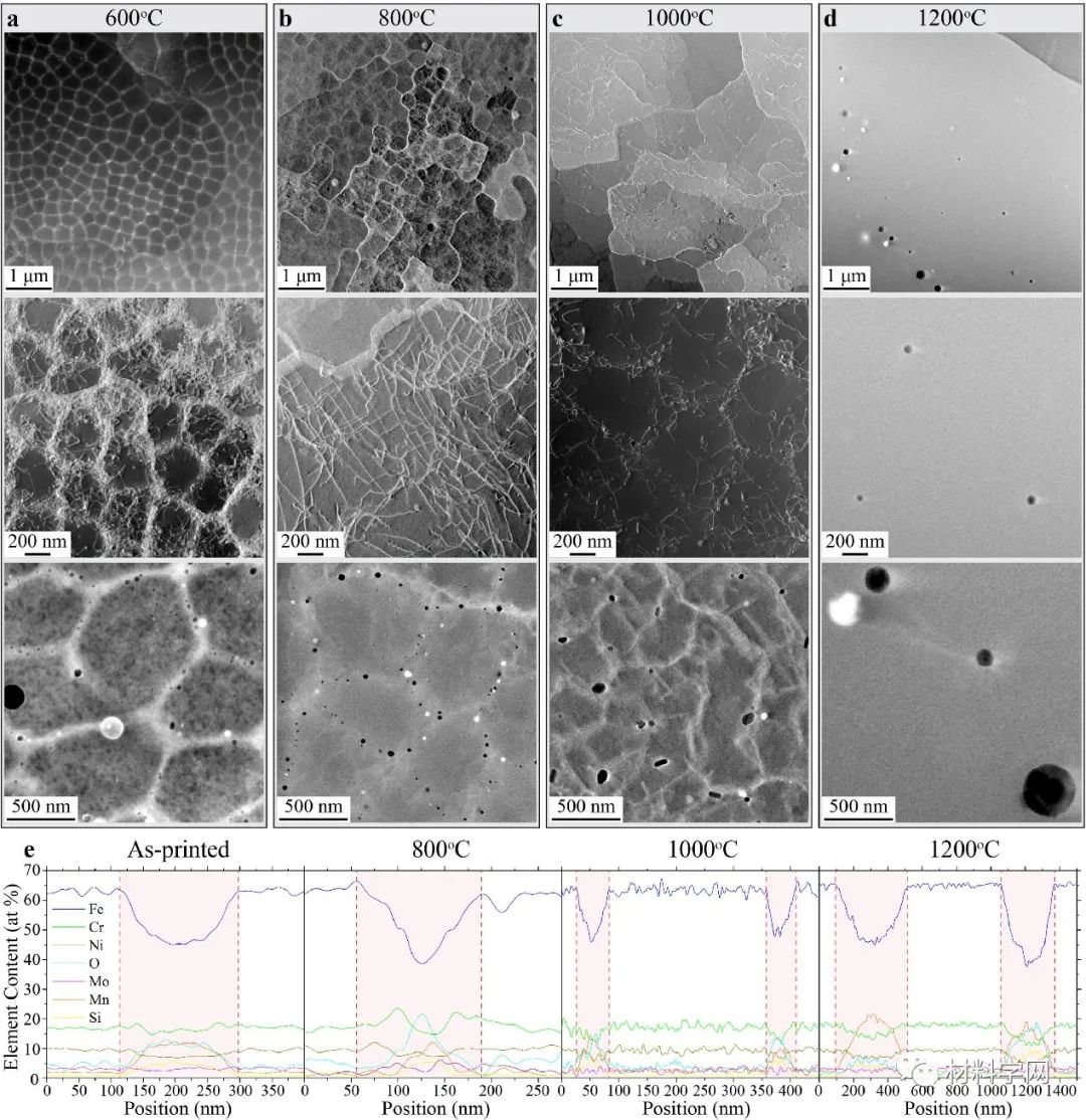 圖8 不同退火溫度下的胞狀結(jié)構(gòu)。a-d STEM/HAADF,分別在600、800、1000和1200 °C退火的樣品中以三倍放大率拍攝。e通過不同退火溫度下的沉淀物進(jìn)行STEM/EDS線分析。
