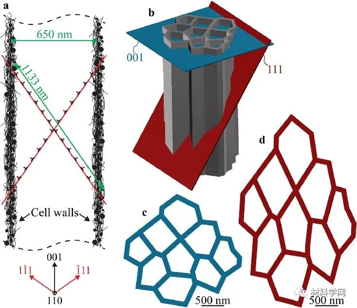 圖11 位錯(cuò)胞結(jié)構(gòu)。a,示意圖向上表示單個(gè)單元格。b示意圖,表示{001}和{111}型平面截取的一組具有相同晶體取向的晶胞c和d它們在這些平面上的投影結(jié)果。