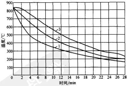 空冷或鼓風冷的冷卻能力比水冷、油冷小得多,故在一定程度內可避免鍛件內部缺陷的擴大,但空冷時鍛件的性能潛力不能充分發揮。圖12 、圖13 是大鍛件的空冷曲線。