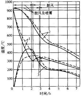 噴霧冷卻是利用壓縮空氣與壓力水的共同作用,使之成為細霧狀向工件表面噴射的冷卻方法。噴水冷卻是將高壓水直接向工件表面均勻噴射的冷卻方法。在噴射冷卻時,工件要旋轉,以使冷卻均勻。這種冷卻方式的優點是在冷卻過程中可以改變風量、水量及水壓,以達到調節冷卻速度的效果,使在不同冷卻階段得到不同的冷卻速度。對有階梯的工件,在不同截面處可以調節得到不同的冷卻能力,使之獲得相同的冷卻速度。噴水冷卻的冷卻能力很強烈,高壓水還可以猛烈沖刷工件加熱時表面形成的氧化皮。圖17 所示為噴霧冷卻曲線,圖18 所示為噴水冷卻曲線。