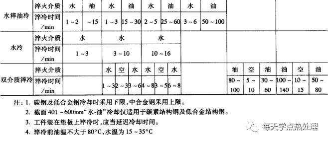 冷卻時間是指工件在冷卻介質中停留的時間。冷卻時間過短,會達不到要求的性能,而冷卻時間過長、終冷溫度過低,會增大淬裂的危險性。所以,確定適當的冷卻時間及終冷溫度,是大鍛件熱處理工藝中的一個重要問題。在生產中的淬火冷卻主要是控制冷卻時間,而工件表面的終冷溫度僅作為參考。冷卻時間一般根據實測的各種冷卻曲線,理論計算以及長期生產經驗來確定。必須注意,即使相同截面的工件,在相同的淬火介質及冷卻時間內冷卻,也會由冷卻設備容量、淬火介質的溫度、介質循環條件及工件在介質中的移動方式等情況不同,造成工件心部溫度的顯著差別。所以,在規定冷卻時間的同時,還要嚴格控制冷卻條件。圖19 和圖20 所示為不同直徑鋼件在水冷、油冷、空冷時,心部冷卻到450℃和300°C 時所需的冷卻時間(淬火溫度取為860°C, 淬火介質溫度取為40℃) , 曲線是由實測數據整理而得到的。表3 列出一些具體冷卻工藝可供參考,生產中根據工件形狀、材質及生產條件,在制訂具體冷卻工藝時,作適當調整。▼表3 具體冷卻舉例