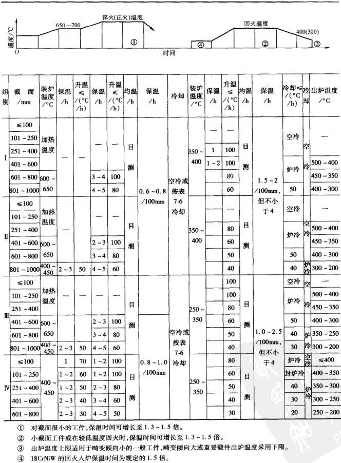 一般常用大鍛件用鋼,按其導熱性能,碳化物溶解的難易程度以及對終冷溫度的要求,可劃分為以下四組:第一組 碳含量(質量分數)小于0.45%的碳素結構鋼及低合金結構鋼;第二組 碳含量(質量分數)大于0. 45%的碳素結構鋼及低合金結構鋼;一般大型鍛件的第二熱處理工藝規范可歸納為如表6 和表7 所列。各組按工件截面大小具體選定工藝參數。對截面更大、合金元素很高的重要鍛件應參考專門著作慎重制定。