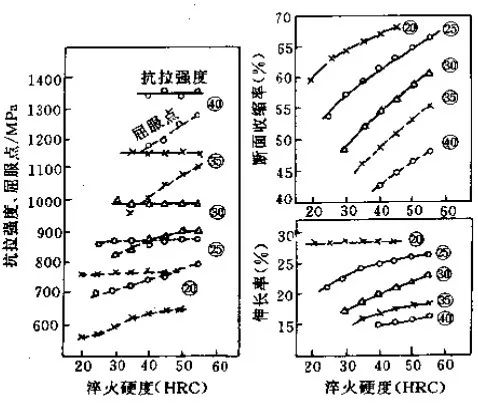 40Cr鋼經過830℃加熱在不同淬火冷卻速度下獲得不同層淬火硬度后,通過不同的淬火溫度,回火得到不同的回火硬度,然后進行拉伸試驗。結果表明,抗拉強度取決于最后回火硬度,幾乎不受淬火硬度的影響;而屈服度強度、伸長率和斷面收縮率不僅取決于回火硬度,也與淬火硬度有很大關系,在回火得到相同硬度的條件下,這些性能指標隨淬火硬度的升高而提高。因此,淬火回火工件不能只控制其回火后的硬度,還應檢驗淬火后的硬度,以便檢查工件淬火是否充分,不充分的淬火,在大多數時候應作為熱處理缺陷重新返工處理。
