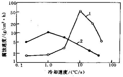 由于鉻在鐵素體型不銹鋼中的擴散速度比在奧氏體型不銹鋼中快約兩個量級,因而鐵素體型不銹鋼的T-T-S曲線位于奧氏體型不銹鋼的下方。T-T-S是在等溫條件測得的,在熱處理實踐中,鉻的碳化物能否沿晶界析出和析出后對晶界腐蝕抗力的影響程度取決于冷卻速度和冷卻開始溫度。冷卻速度快時,析出鉻的碳氮化物造成的貧鉻區能夠通過鉻的擴散得以恢復,故在某一冷卻速度下,晶間腐蝕敏感,如圖7 所示 。