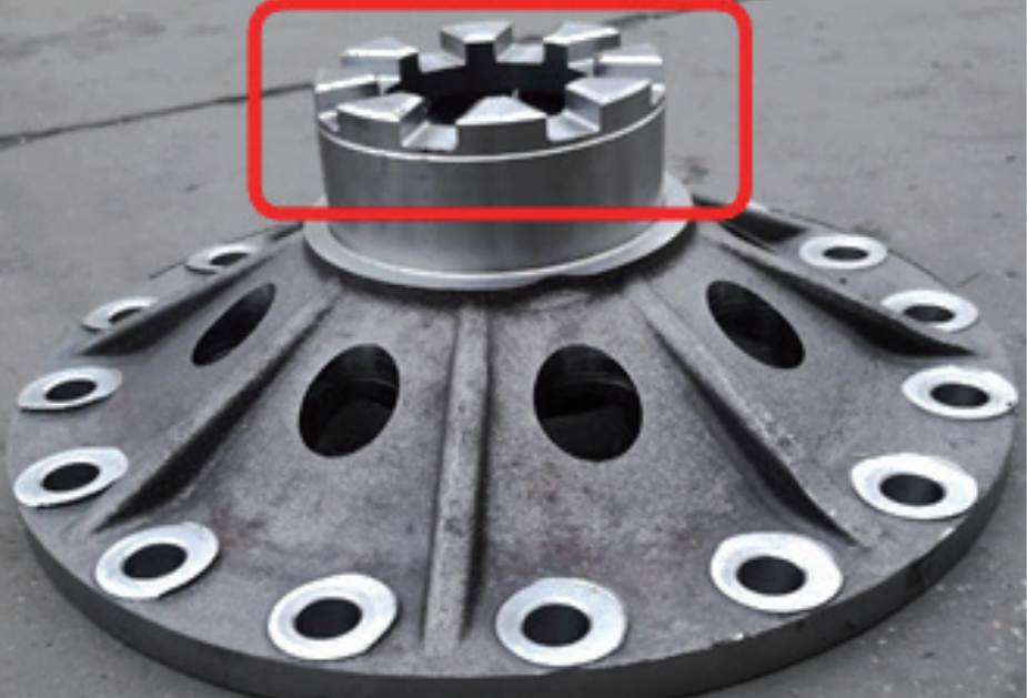 某牙嵌強(qiáng)制鎖住式差速器殼材料為40Cr鋼,結(jié)構(gòu)如圖1所示,實(shí)體如圖2所示。圖1a中d與D結(jié)合齒部淬火,硬化層如圖1b所示,淬火區(qū)在圖2中紅色方框內(nèi)端面齒部,硬化層深:R1處≥1mm,A處3~9mm,B處≥1mm。