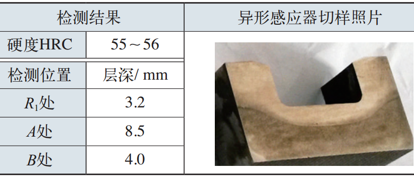 異形感應(yīng)器具體設(shè)計(jì)參數(shù)見(jiàn)表4,調(diào)試參數(shù)見(jiàn)表5,淬硬層檢測(cè)結(jié)果見(jiàn)表6。