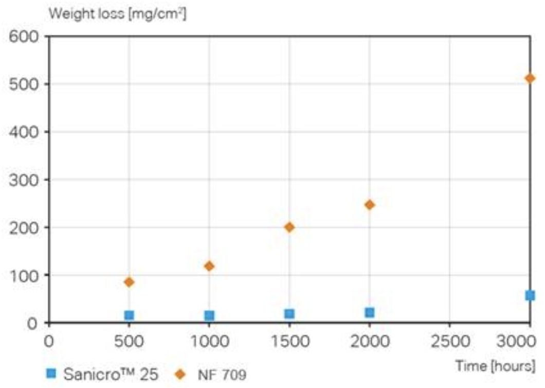 抗腐蝕和抗蒸汽氧化能力是檢驗鋼材質(zhì)量的關(guān)鍵指標(biāo)。得益于含量極高的鉻元素護身,Sanicro 25在這兩方面所向披靡。在測試中,它與競爭對手最好的鋼材比拼抗熱腐蝕性,暴露在氣流中持續(xù)3000小時,對手的重量損失達500mg/ c㎡,而Sanicro 25的重量損失僅70 mg/ c㎡。在抗氧化性能測試中,它也有出色表現(xiàn)。正是如此,采用了Sanicro 25的鍋爐,自然能夠從容應(yīng)對620°C (1160°F)、650°C (1200°F)乃至700°C (1290°F) 的溫度。
