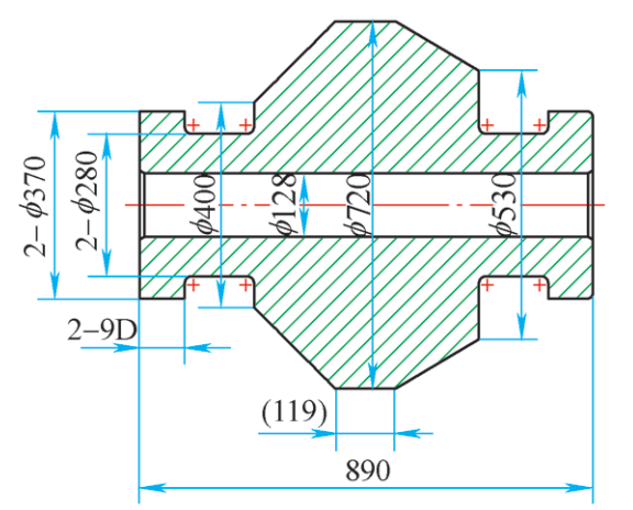 壓裂頭材料為30CrNi2MoV。技術(shù)要求:230~286HBW。產(chǎn)品最大直徑為750mm,高度為890mm,中心孔尺寸為φ130mm,結(jié)構(gòu)尺寸如圖2所示。