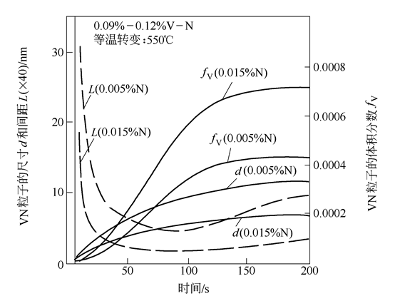 為抑制鋼中氮的有害作用,最常用的方法是向鋼中添加適量的固氮元素,如鋁、鈦、釩等。在這些固氮元素中釩是最有效的,釩是唯一對(duì)氮具有雙重影響的元素,它不但通過(guò)形成VN或富氮的V(C,N)固定鋼中的自由氮,抑制氮的有害作用,而且還能產(chǎn)生顯著的析出強(qiáng)化和晶粒細(xì)化。特別應(yīng)當(dāng)指出,利用氮的作用可使析出粒子細(xì)小彌散分布在鋼中,使析出強(qiáng)化達(dá)到最佳化,如圖2所示。由圖可以看出,隨著氮含量的提高析出粒子尺寸減小,析出相體積分?jǐn)?shù)增加,析出粒子間距減小,析出強(qiáng)化顯著增大,氮在析出強(qiáng)化中起到非常大的作用。因而在釩鋼中氮就由有害的雜質(zhì)元素轉(zhuǎn)變成一種不可或缺的微合金元素。