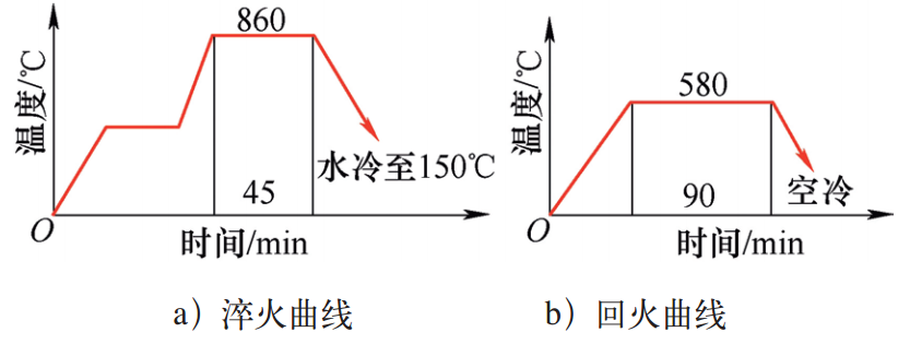 淬火860℃,保溫45min,水冷至150℃;回火580℃,保溫90min,空冷至室溫,工藝曲線如圖4所示。