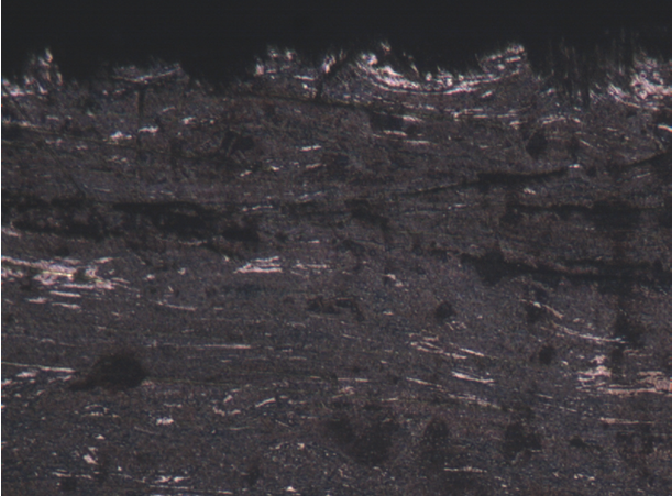 由上可知,該折疊失圓部位經(jīng)過了二次加熱,而且加熱溫度很高,應(yīng)該在1300℃以上。只有超過這個溫度,才能使表層形成過熱過燒組織。高溫加熱后經(jīng)過局部壓力加工,表層及次表層形成變形程度很大的纖維狀混合組織。試樣左側(cè)表層的白亮層為半脫碳層,深度為0.30mm,屬于正常的原材料軋制表面組織(見圖9)。在脫碳層的表面,局部出現(xiàn)變形程度很大的纖維狀組織,這是由于壓力加工使該部位受力變形造成的,因為脫碳部位的韌性較好易變形(見圖10)。