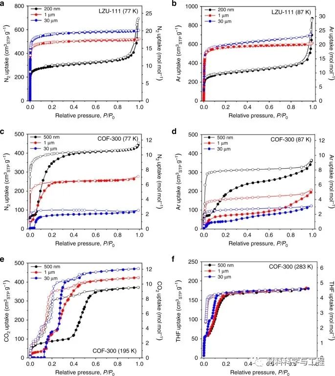 圖4 不同尺寸COFs的氣體吸附實驗與分析(固體循環、吸附;空心圓,解吸。