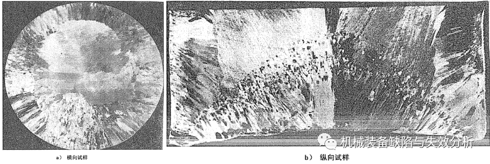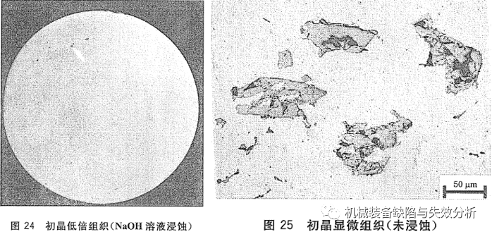 該缺陷在侵蝕后的低倍試樣上,多呈凸起的的邊界輪廓清晰的暗褐色塊狀、針狀聚集物,其顯微組織為形狀規則的粗大化合物,斷口上呈閃耀反光的