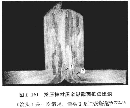 在擠壓制品尾端橫向低倍試樣上常出現與二次縮尾相似的一種環狀條紋,顯微組織觀察,其金屬組織連續性未受破壞,不是二次縮尾。