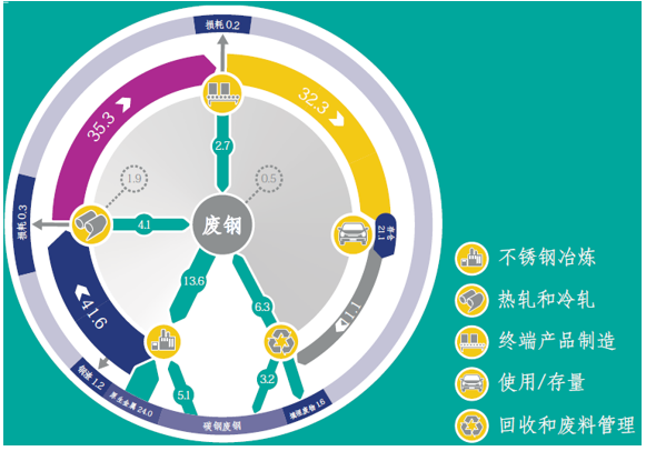 外環為不銹鋼轉化為產品(如汽車、家用產品、工業機械等)、使用和回收利用系統的邊界。這是一個動態過程。箭頭表示不銹鋼進入和離開系統。所有數值均以每年百萬公噸(Mt)不銹鋼為單位(由于四舍五入,數值總和可能會有偏差)。