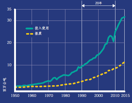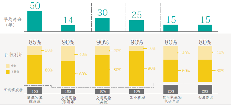 過去20年中國不銹鋼產量的增長帶動了全球不銹鋼產量以每年約6%的速度遞增。2015年,中國不銹鋼產量占世界總量一半以上(53%)。不銹鋼消費量從2000年的10%上升為39%。平均而言,目前消費后可回收的材料大約是20年前投入使用的,這充分說明不銹鋼使用壽命長。從該圖可以看出,理論計算的最大再生量受到報廢回收不銹鋼的可用性限制,報廢回收可用性又取決于終端產品過去的產量、增長率和使用壽命。
