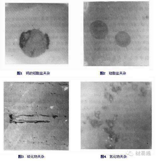 說明:在橫向酸性試片上見到一些無金屬光澤,呈灰白色、米黃色和暗灰色等色彩,系鋼中殘留的氧化物、硫化物、硅酸鹽等。
