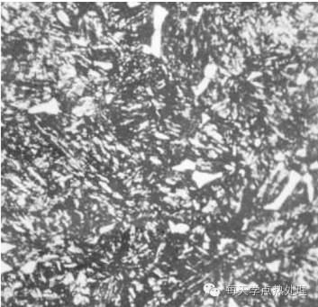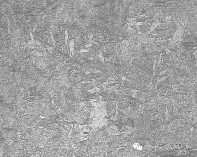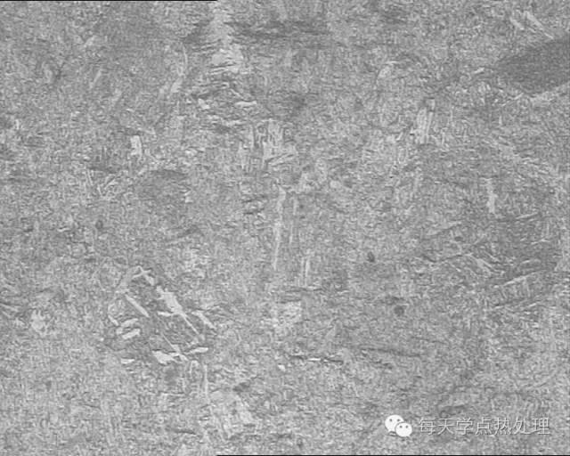 此件加熱溫度不足或保溫不夠導致塊狀鐵素體未完全奧氏體化,淬火后保持了塊狀鐵素體形態。這樣組織性能很難合格。調質件避免出現此種組織形貌。此種組織多見于原材料中存在魏氏組織后淬火后形貌。