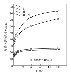 (3)較低的晶粒粗化速率。再結晶控制軋制鋼,形變-再結晶后要求有較低的晶粒粗化速率,以保證再結晶后獲得盡量小的奧氏體晶粒,為此研究了釩鋼的奧氏體再結晶晶粒粗化行為,如圖3所示。在1050℃恒定溫度下,以2/s的真應變速率單向壓縮55% (ε=0.8),形變后在1050℃下保持不同時間,然后水淬。結果表明,V鋼、V-N鋼、V-Ti鋼、V-Ti-N鋼沒有晶粒異常長大現象。晶粒長大速率示于表1。由圖和表可以看出,V鋼和V-N鋼形變-再結晶后,保溫20s時奧氏體晶粒有長大現象,但是值得特別注意的是鋼中加入0.017%Ti后顯著降低了奧氏體晶粒粗化速率,在1050℃保溫20s時,其晶粒長大速率較小,可忽略不計,保溫時間達100s時,晶粒尺寸基本保持不變,這為反復軋制形變-再結晶和終軋后的加速冷卻創造了有利的條件,拓寬了再結晶控軋操作時間的工藝途徑,因此,對要求熱軋后具有較低晶粒粗化速率的釩鋼來說,加入0.017%Ti是一種最佳選擇。