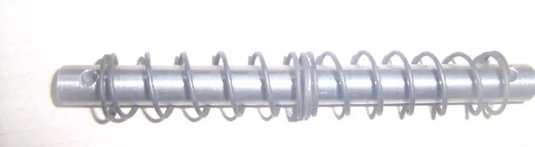 為保證鋅粉與工件的充分接觸,滲鋅一般采取粉末滾動(dòng)滲鋅法,即將工件和滲鋅劑按一定比例裝入一個(gè)能轉(zhuǎn)動(dòng)的箱子(俗稱轉(zhuǎn)鼓)中,通過(guò)加熱轉(zhuǎn)鼓,實(shí)現(xiàn)“動(dòng)態(tài)”下的擴(kuò)散式滲鋅。可見(jiàn),滲鋅時(shí)彈簧處于不斷轉(zhuǎn)動(dòng)的狀態(tài)下,因此,研究滲鋅過(guò)程是否會(huì)導(dǎo)致彈簧變形是必要的。對(duì)以上試驗(yàn)件分別進(jìn)行了鍍鋅、帶芯桿滲鋅(見(jiàn)圖2)、不帶芯桿滲鋅及不做處理等方式的表面處理,其外觀對(duì)比如圖3~圖5所示。