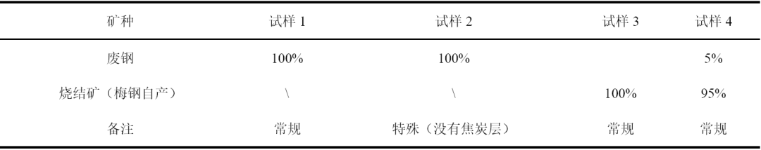 為了研究廢鋼自身軟熔性能及其對燒結(jié)礦混礦軟熔性能的影響,共進(jìn)行了 4 組試驗(yàn),其中廢鋼單種料試驗(yàn) 2 組:一組為常規(guī)試驗(yàn)(試樣上下均鋪 20g 焦炭層),一組為特殊試驗(yàn)(試樣上下均沒有焦炭);燒結(jié)礦單種礦試驗(yàn)一組,廢鋼燒結(jié)礦混料試驗(yàn)一組,均為常規(guī)實(shí)驗(yàn),具體試驗(yàn)方案較表 4.