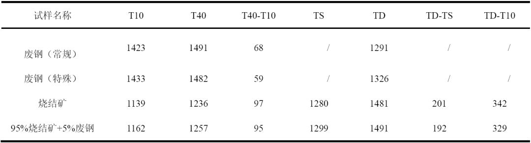 在燒結(jié)中配加5%的廢鋼后,與單種燒結(jié)礦相比,其軟化區(qū)間(T40-T10)、熔融區(qū)間(TD-TS)及軟熔區(qū)間(TD-T10)具有減小,其中熔融區(qū)間減小9℃,熔融區(qū)間減小13℃,這與前述廢鋼的基本軟熔特性相關(guān),所以,在實(shí)際中高爐如果配加一定比例的廢鋼除了能夠增加入爐品位以外,還能夠改善軟熔帶的透氣性,為高爐進(jìn)一步改善技術(shù)經(jīng)濟(jì)指標(biāo)提供有利條件。