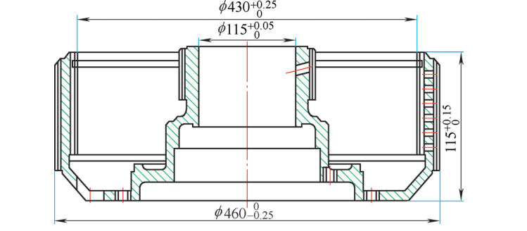 由于淬火工序采用此種淬火壓模,原來(lái)薄壁處的尺寸變化得到了控制。通過(guò)測(cè)量圓度能夠控制在0.25mm左右,“喇叭口”現(xiàn)象未再出現(xiàn);φ115mm的內(nèi)孔由于芯軸的作用,圓度也能夠控制在0.2mm左右,大大提高了零件的淬火合格率。