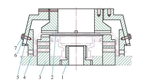 1.芯軸2.內(nèi)壓模3.下模4.滑塊5.外壓模