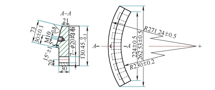 5)將滑塊加工成6塊,并均勻地安裝在外壓模上。這樣外壓模在下落過(guò)程中,可以避免滑塊移動(dòng)時(shí)出現(xiàn)卡滯現(xiàn)象,保證滑塊完全貼合在零件外圓上,從而限制了零件外圓尺寸的變化。