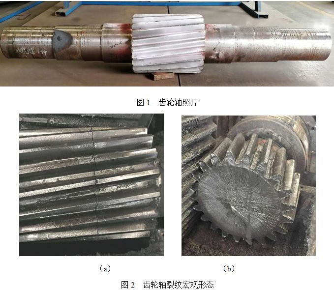 在用戶現(xiàn)場(chǎng)使用過程中,齒輪軸斷裂時(shí)未發(fā)現(xiàn)明顯異常,只是在運(yùn)行中電機(jī)仍在工作,但齒輪軸已不隨著旋轉(zhuǎn)。該齒輪軸使用壽命大概在12個(gè)月左右。齒輪軸的結(jié)構(gòu)如圖1所示,齒輪軸斷裂宏觀形態(tài)如圖2所示。