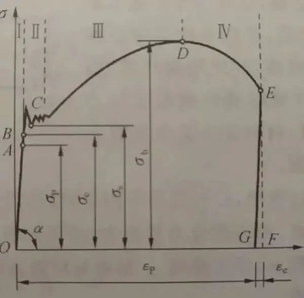 通過對上述關于強度和剛度的理論理解,相對于剛度,強度的定義針對的是外力作用下的破壞;而破壞類型的分類為塑性屈服及脆性斷裂,由此聯想到拉伸時的應力應變曲線。如圖所示。