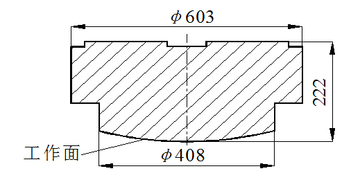 擺輾成形模凸模(見圖2),用于設(shè)計(jì)最大壓力為12500kN擺輾機(jī)上。在模具服役過程中,主要失效形式有凸模(工作)表面熱疲勞和凸模(工作)表面環(huán)狀波紋變形。模具在生產(chǎn)300件產(chǎn)品時(shí),明顯可見表面熱疲勞;模具在生產(chǎn)800件產(chǎn)品時(shí),工作表面出現(xiàn)明顯的環(huán)狀波紋變形。