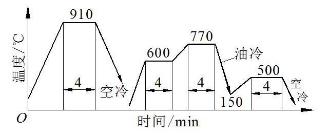 1)淬火前增加正火工序。淬火前增加910℃正火工序(見圖4),其目的是細(xì)化原始組織和碳化物,為下一步降低淬火溫度做好組織準(zhǔn)備。