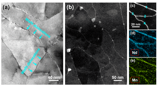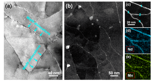 圖1.明場圖像(a)和HAADF-STEM圖像(b)顯示了Mg-2Nd-1Mn樣品中的多晶微觀結構,壓縮了25%,并在250°C退火1 h。這些微/納米級晶粒中的大多數具有彼此平行的<112 directions0>方向。(c–e)Mg-2Nd-1Mn合金的STEM-EDS映射結果。HAADF-STEM圖像(c)和與元素Nd(d)和Mn(e)有關的相應EDS映射圖像。