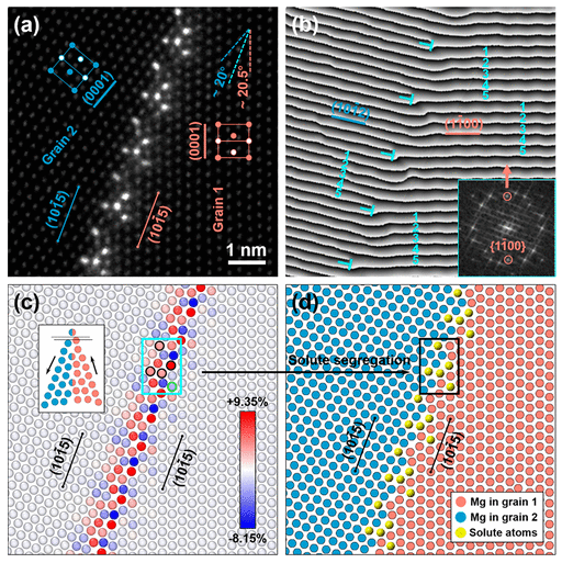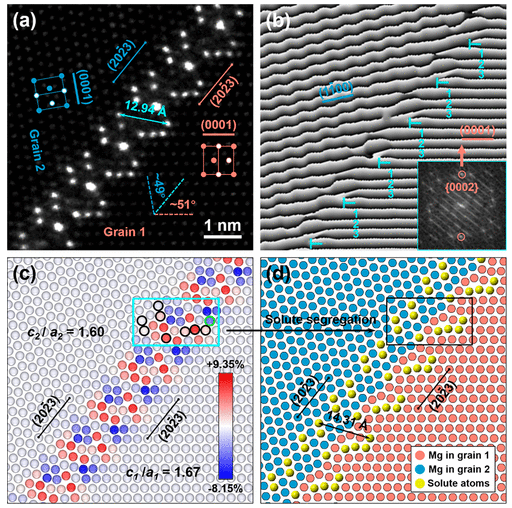 圖2.(a)原子尺度的HAADF-STEM圖像,顯示了沿<112→0>傾斜軸觀察的線性ATGB中的溶質分離。傾斜角度θ 1 = 51°,θ 2 = 79°(I型)。(b)相應的經傅立葉濾波的原始相位圖像,顯示了線性邊界中五個(0001)G1 /(101?2)G2原子層分離的MD的陣列。(c)Voronoi分析圖,顯示壓縮和延伸位點交替分布在純鎂線性ATGB上。(d)I型界面上層結構的溶質離析模型。