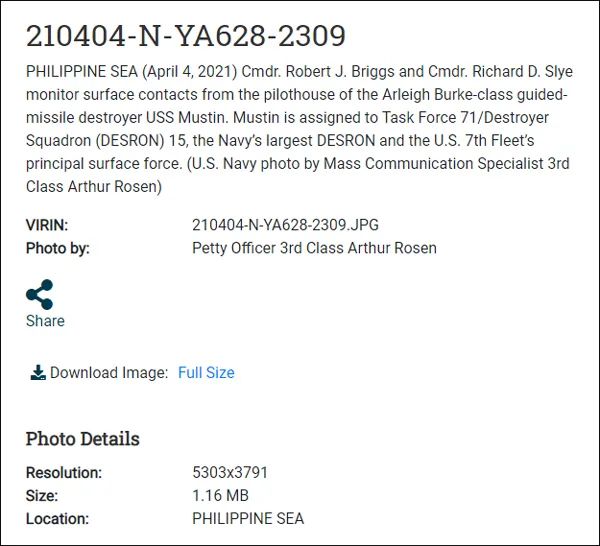 照片圖注顯示,該照片于4月4日拍攝于菲律賓海,圖中兩名軍官分別是羅伯特·布里格斯中校與理查德·斯萊中校,他們正在“阿利·伯克”級導彈驅逐艦“馬斯廷”號的駕駛室里監測水面接觸情況。“馬斯廷”號隸屬于第71特遣部隊/第15驅逐艦中隊,這是美海軍最大的驅逐艦中隊,也是美國第七艦隊的主要水面部隊。