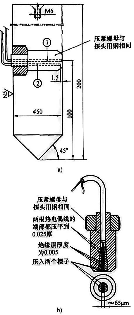 a) 探頭示意圖 b) 熱電偶細節