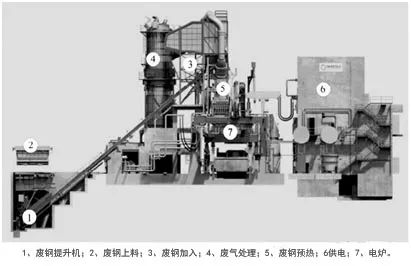 傳統(tǒng)頂裝料電爐,設(shè)備簡單,占地、投資較少,操作靈活簡單,適合多元化廢鋼;但其生產(chǎn)過程非連續(xù)性,導(dǎo)致熱量損失較大,且存在無組織排放等問題。理論值,一爐冶煉周期60min,電耗400kWh/t,電極消耗2.0kg/t。