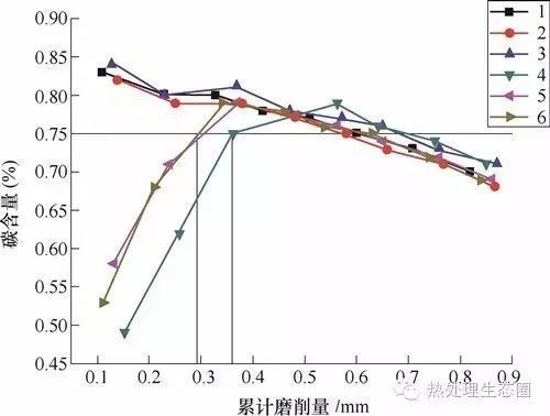 共對(duì)6個(gè)試樣進(jìn)行了8次磨削及表面碳含量的檢測(cè)。各試棒的單次磨削量、累計(jì)磨削量及相應(yīng)的表面碳含量記錄見(jiàn)表1、表2。
