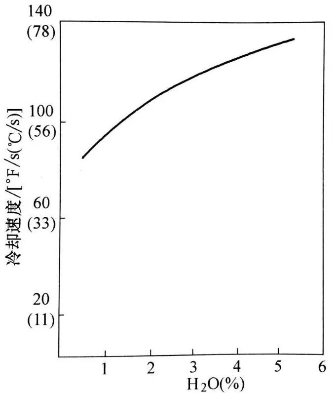 圖11 也表明,隨著水的加入,沸點降低得更迅速。據報道,只要鹽浴溫度保持在含水混合物(即鹽浴)最終的沸點以下含水量可以長時間保持。但是,當熾熱鋼件浸入含水混合物中后,溫度可能暫時超過沸點,一部分水將被汽化,要維持這個組分則要添加新水。因此,為減少淬火過程中水分的流失,較好的辦法是使淬入的鹽混合物溫度更靠近凝固點而不是沸點。迪拜鋁業(Dubal ) 報道稱,加入1%的水將使干鹽(無水的鹽)的熔點降低11℃ (20°F) , 而加入2% 的水則降低19℃ (35°F) 。雖然三元混合鹽淬火的溫度范圍為150~600℃ (300~1110°F), 但是加入10% 的水便可以在80℃ (175°F)的低溫下進行鹽浴淬火。更具代表性的含水量是0.5%~2%, 以滿足更常規的操作溫度范圍150~290℃ (300~550°F) 。添加的水不是淡水,而是清洗槽里的鹽溶液。也有人用低壓蒸汽代替水的。水在鹽浴中的飽和含水量與鹽浴溫度的函數關系見表10 。出于安全考慮,要求將水加入良好攪拌的鹽浴中而不能加入無攪拌的鹽浴中。熔融鹽的淬冷烈度與礦物油大致相同,兩者的格羅斯曼 H 值對比見表11 。兩者的冷卻速度都慢于水、鹽水溶液以及聚合物水溶液。隨著聚合物水溶液組成、濃度及攪拌方式的改變,淬冷烈度的變化范圍可以涵蓋從熔融鹽和礦物油到鹽水溶液的淬冷烈度。