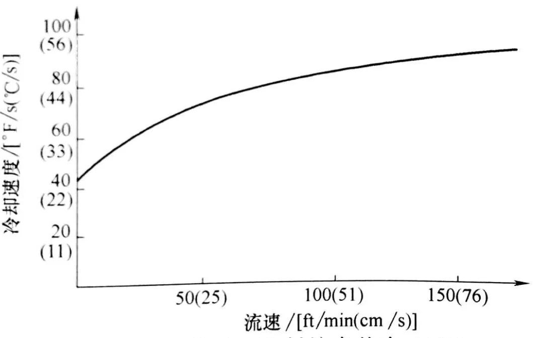 空氣作為一種氣體,通過膜沸騰機制來冷卻熱鋼件。與其他淬火冷卻介質相比,靜止空氣的相對烈度見表1。如其他淬火冷卻介質一樣,空氣的冷卻速度取決于流經鋼件表面的空氣的流速,見圖1 。雖然空氣是易得且廉價,但是空氣淬火一般無法提供足夠的淬冷烈度來使大多數鋼硬化。