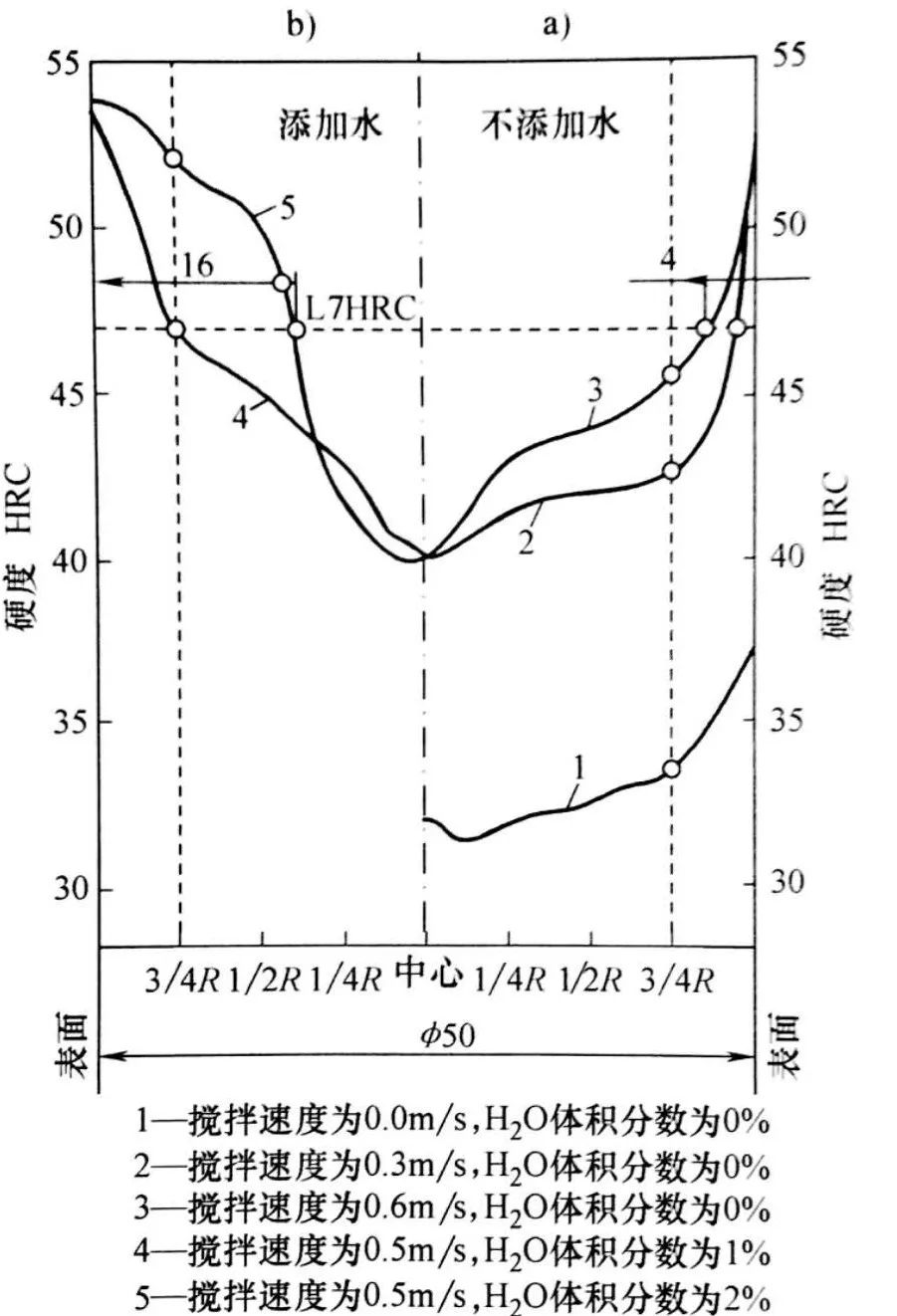 水的加入和攪拌結合起來,可以使冷卻速度(淬冷烈度)增加3倍。Liscic, 通過淬用 AISI 4140鋼制造的Φ50mm×200mm (Φ2in×8in) 的圓棒并在橫截面上檢測洛氏硬度分布情況,證明了攪拌速度和水的添加對200℃ (390℉)熱鹽浴[德固薩(Degussa) AS-140] 的影響。圖15 表明,攪拌比不攪拌帶來的硬度增加更大。但是,加2%的水之后,硬度和淬硬深度又得到了進一步的增加。對比3/4R處的硬度值可以發現,良好攪拌并添加2%的水,比無攪拌也不添加水時硬度提高了 19HRC 。對于47HRC的硬化深度,加2%水的比不加水時增加了4倍。